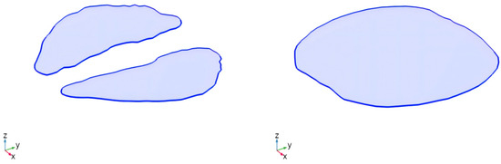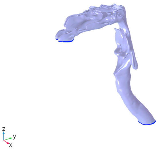 Setting model parameters involves selecting appropriate physical fields, defining material properties, and establishing boundary conditions. The “Fluid Flow” module with a “Turbulence” model is used to simulate airflow dynamics within the respiratory tract, while the “Dilution Substance Transfer” and “Chemical Substance Transfer” modules are employed to model the attachment, diffusion, and transport behavior of elements on particulate matter. Based on experimental data and reference [23], the material properties of PM2.5 particles—such as density, particle size distribution, and shape coefficient—are defined, along with setting the diffusion coefficient of characteristic elements to 0.01 m2/s, assuming adherence to particle surfaces. Simultaneously, the physical properties of air, including density and viscosity, are specified. Boundary conditions are set to simulate inhaled airflow by configuring air velocity and pressure at the respiratory inlet, with the molar concentration of PM2.5 at the nasal cavity entrance defined based on sampling data. An attachment diffusion model for characteristic elements on particulate matter surfaces is established using a surface fluid transport model. Finally, outlet conditions at the bronchus terminus allow airflow and particulate matter to exit the system. A schematic diagram of the model’s entrance and exit is provided in Figure 5.