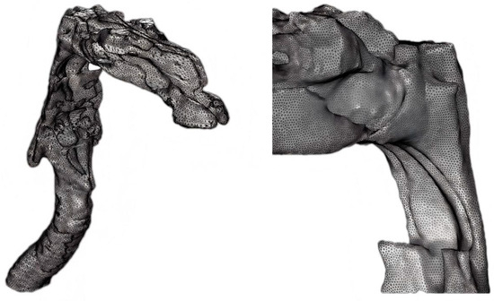 In this study, a three-dimensional model of the human upper respiratory tract was developed (Figure 4), encompassing three key anatomical structures: the nasal cavity, throat, and bronchi. This model aims to simulate the flow and diffusion behavior of gases and particles within the respiratory system. Air and particulate matter initially enter the upper respiratory tract via the nasal cavity. The intricate structure of the nasal cavity influences airflow distribution and provides initial filtration for larger particles. Below the nasal cavity, the throat is relatively narrow, causing air velocity to increase as it passes through this region. This acceleration affects the distribution and deposition of particulate matter in the upper respiratory tract. The lower part of the model consists of the bronchi, which are elongated and extend downwards, serving as conduits for air and particles to reach the lungs. The shape and curvature of the bronchi influence particle trajectories, particularly affecting the deposition of larger particles. This three-dimensional model accurately replicates the anatomical features of the respiratory tract, especially in complex areas such as bends and branches, enabling a realistic simulation of airflow direction changes and particle flow paths. By incorporating these detailed anatomical features, the model can provide insights into how structural characteristics impact airflow dynamics and particle deposition patterns within the respiratory system.
