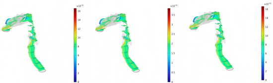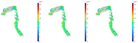Figure 7 illustrates the concentration distribution of characteristic elements As, Co, and Cd within the respiratory system for PM2.5 at time T = 1 s. As exhibits a higher concentration in the middle and posterior regions of the respiratory tract, with concentrations reaching approximately 1.27 × 10−11 mol/m3 in high-concentration areas, far below the national ambient air quality standard for As (6 ng/m3, annual average) [25] and relevant reference reports [26,27]. In contrast, Co and Cd show relatively uniform but lower concentrations, mainly affecting the upstream parts of the respiratory tract where airflow slows down. The concentration of Co is around 3.45 × 10−11 mol/m3, while that of Cd is approximately 1.03 × 10−11 mol/m3. The concentration of Co is generally lower than the limit value (2 ng/m3) for Co in ambient air determined by the WHO air quality guidelines [28,29], and the concentration of Cd is lower than the national ambient air quality standard for Cd (5 ng/m3, annual average) [25] and limit values for Cd in ambient air determined by the WHO (5 ng/m3) and EU (5 ng/m3) air quality guidelines [28,29]. In summary, the uniform distribution of Cr and Cd primarily influences the upper respiratory tract, especially in regions where airflow velocity decreases. This pattern highlights the differential deposition and transport behavior of these elements within the respiratory system.