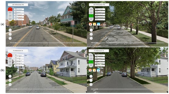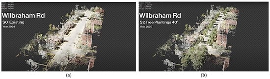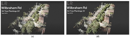 Figure 3 presents still images of the street tree plantings spaced at 20 feet of distance for (a) Wilbraham Road and (b) Albemarle Street. Interactive representations of these scenarios are found in Videos S1 and S2.