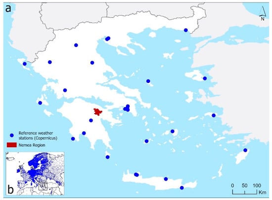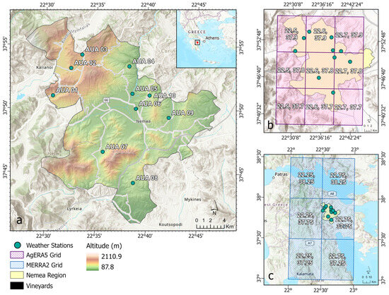 The Nemea Protected Designation of Origin (PDO) wine-region covers an area of about 2700 ha, and it is the largest PDO zone in Greece. It is located in the northeastern part of Peloponnesus, Greece (37°49′4″ N, 22°39′43″ E) (Figure 1a), and holds historical significance for its longstanding viticultural tradition [28]. The region’s Mediterranean climate, characterized by warm, dry summers and mild winters with limited precipitation and abundant sunlight, provides optimal conditions for viticulture [15,29]. Nemea’s terroir, defined by limestone-rich soils and diverse altitudes ranging from 94 m to 1072 m with an average of 382 m, contributes to the unique flavor profiles of its wines [28]. The steep terrain (Figure 1a) creates a challenging environment with extreme spatial variability in weather and soil conditions, which complicates agricultural water management. For this reason, this area was selected as a good case study for evaluating the usability of global climate datasets for small-scale agricultural applications and, specifically, irrigation management.