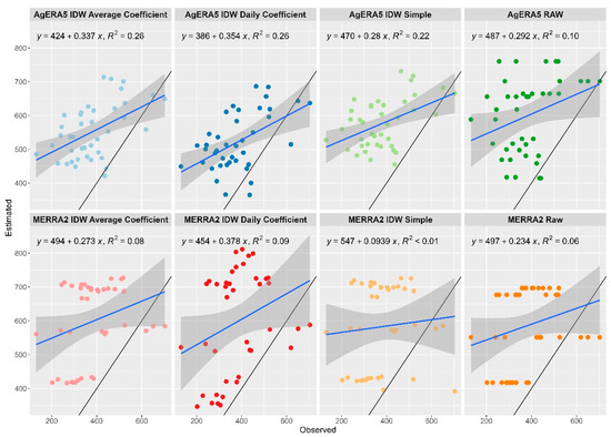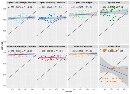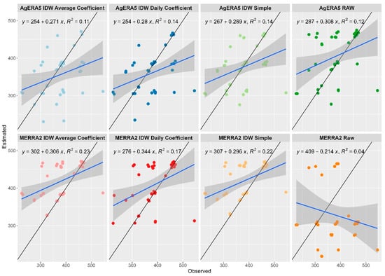 As a first step in the analysis, the estimated values based on AgERA5 and MERRA-2 datasets were plotted against the corresponding values based on the observed data. Then, linear regression lines were used to assess the strength of the relationship between the estimated and the observed values. The primary metric used in this case to evaluate the models’ performance was the coefficient of determination (R2) with values closer to 1 meaning better performance and values lower than 0.5 indicating a weak correlation. Furthermore, an intercept of the linear regression near 0 and a slope near 1 indicate better performance (estimated values coinciding with the observed values).
