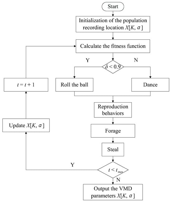 Figure 1 illustrates the optimization process of VMD parameters using the DBO algorithm. First, the positions of the dung beetles are initialized. The fitness function, which aims to minimize envelope entropy, is employed to identify the optimal VMD parameters K and α. Envelope entropy effectively measures the complexity of a signal, with smaller entropy values indicating stronger sparsity and regularity of the modal components. Minimizing the envelope entropy helps reduce mode mixing and enhances the effectiveness of VMD decomposition [36]. Therefore, the success of VMD parameter optimization lies in using the DBO algorithm to search for different combinations of VMD parameters K and α that minimize the sum of the envelope entropy of the decomposed modes. During each iteration, the dung beetle population undergoes various behavioral patterns in a predetermined ratio of 6:6:7:11 for ball-rolling, dancing, reproduction, foraging, and stealing behaviors, respectively. Specifically, when the proximity threshold δ is less than 0.9, six beetles are selected to engage in dancing behavior. If δ exceeds 0.9, six beetles instead exhibit dancing behavior. Subsequently, six beetles participate in reproduction, seven in foraging, and eleven in stealing. After each behavioral phase, the positions of the dung beetles are updated based on the outcomes of their respective actions. These updated positions serve as inputs for the subsequent iteration, where the fitness function is re-evaluated. The algorithm iteratively sorts the results from each iteration and terminates upon reaching the maximum iteration count. At this point, it outputs the VMD parameters K and α that correspond to the minimum fitness function value, thereby achieving the optimization objective.