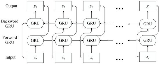 The Gated Recurrent Unit (GRU), a variant of Recurrent Neural Networks (RNNs), offers a streamlined architecture compared to Long Short-Term Memory (LSTM) networks. Despite its simplicity, GRU achieves comparable performance to LSTM with fewer parameters, resulting in faster computation speed. At the core of the GRU model lies its network module, which incorporates two crucial gate mechanisms: the update gate and the reset gate. These gates empower the model to dynamically determine, at each time step, the extent to which previous information should be retained and how much new information should be incorporated. The Bidirectional Gated Recurrent Unit (BiGRU) extends the capabilities of the GRU by incorporating a bidirectional recurrent structure. This innovative design comprises two parallel GRU layers: one GRU processes the input data sequentially in the forward direction, while the other traverses the data in the backward direction. This bidirectional approach enables he model to capture not only past but also future context information, thereby enhancing its ability to comprehend the entire sequence and identify long-term dependencies. The framework of the BiGRU is illustrated in Figure 2.