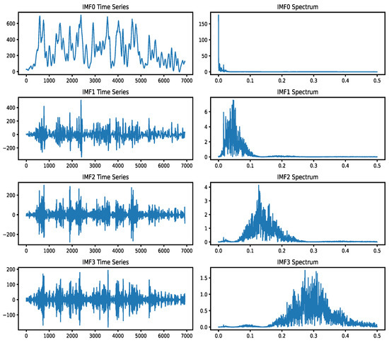 The spectrum of the decomposed series is obtained through Fourier Transform. The decomposed modal time series and the corresponding spectrum are shown in Figure 5. The original WPD sequence is decomposed into four IMFs. Each IMF possesses a distinct central frequency spectrum position, each operating independently of the others. Each IMF represents the frequency fluctuations of the original WPD sequence concurrently. When compared to the original WPD sequence, the decomposed sequence exhibits enhanced predictability and regularity. Consequently, both the IMFs and the original WPD sequence are chosen as inputs for determining temporal feature values.