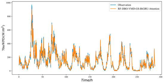 Figure 6 shows the observed and predicted WPD from the RF-DBO-VMD-GS-BiGRU-Attention model. Notably, during the initial 100 h, there is a certain degree of deviation between the model prediction results and the observed values, although the error remains within an acceptable range of 100 W/m2. Subsequently, over the following 188 h, when WPD undergoes more gradual changes, the predictive performance of the model demonstrates a noticeable improvement.