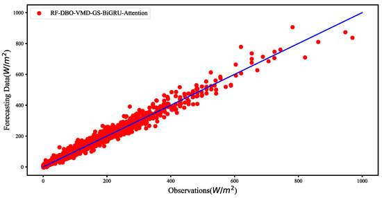 Figure 7 presents a scatter plot of the predicted results and the observed WPD. The plotted points cluster tightly around the line at approximately 600 W/m2, suggesting superior predictive accuracy for values beneath this threshold, with a slight degree of dispersion observed for values exceeding 600 W/m2. Both Figure 6 and Figure 7 illustrate that this model correctly captures the overall trend for mid-term predictions, showcasing a high level of prediction accuracy. The model exhibits good performance in predicting WPD, both for data with high-frequency fluctuation and data marked by stability.