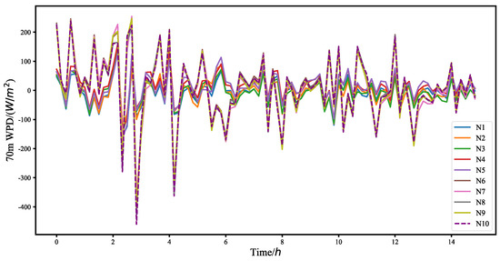 Wind measurement data collected from an anemometer tower situated in Modoushan, Yunnan Province of China, were employed as a case study. The dataset spans from 9 November 2009, to 10 November 2010, with a time interval of 10 min, including wind speed and direction and WPD at 70 m, and wind speed and direction at 50 m, as well as air temperature and air density. For the experimental analysis, a subset of 6912 observational data (from 3 June 2010, to 20 July 2010) were selected and partitioned into training and testing sets in a 3:1 ratio. Additionally, to eliminate potential biases stemming from variations across different datasets, the input data underwent a standardization process to ensure uniformity and comparability.
