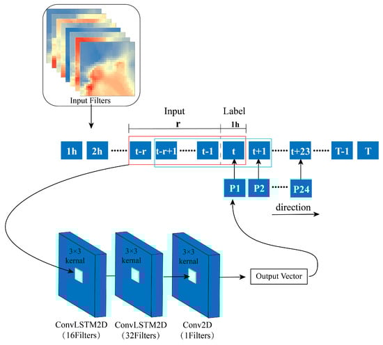 14]. In order to better utilize the temporal and spatial correlation, convolutional LSTM (ConvLSTM) is introduced. ConvLSTM is a variant of the LSTM model that treats each time step of the input data as a two-dimensional space (similar to an image) and incorporates convolutional operations. This allows LSTM units to simultaneously process both temporal and spatial information, thus, better capturing the correlation between them [