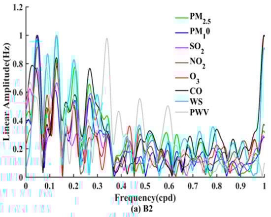 When training the model, it is essential to carefully select appropriate hyperparameters. The FFT can be employed to determine the common change period (CCP) between the elements and assist in constructing improved features. We utilized the FFT method to analyze the cycles per day visual angle (cpd) of each element; 1cpd corresponds to 24 h, allowing us to determine the element’s hourly cycle of change by dividing 24 h by the cpd. Due to the different influencing factors, the water vapor content changes with temperature, so the daily variation of PWV shows a unimodal pattern. On the other hand, the daily variation of atmospheric pollutants is influenced by human activities and natural factors, leading to a bimodal pattern in the morning and evening. Consequently, the CCP within one day is not considered, and the time series of the elements are mapped by the linear transformation to the range between 0–1. By analyzing the FFT results of each element, we identified the position of common oscillation frequencies (common peaks or troughs). The significance of a period is determined by the linear amplitude, with larger amplitudes indicating more prominent periods. For instance, at site B2 in the mountainous region, the three most notable common oscillation frequencies are 0.13, 0.21, and 0.48, corresponding to periods of 185 h, 114 h, and 50 h, respectively (Figure 7a). Similarly, at site C5 in the plains, the three most prominent common oscillation frequencies correspond to periods of 185 h, 92 h, and 51 h, respectively (Figure 7b).
