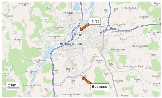 The measurement field campaign was conducted with a Beenose sensor located in Pouilly (49.050625° N, 6.186049° E), 7 km south of Metz, in eastern France, at an altitude of 200 m above sea level. The sensor was installed on the roof of the Town Hall, at a height of about 5 m above the ground. The Hirst reference sensor used by the National Network of Aerobiological Monitoring (Réseau National de Surveillance Aérobiologique, RNSA) is positioned on the roof of a 7-floor administrative building in the city of Metz (49.126818° N, 6.1771441° E), 8 km from the Beenose sensor. Figure 1 shows the location of the two sensors. The Hirst sensor is located in an urban area, which is mainly made up of houses and buildings, and small, scattered tree areas can be identified in proximity. The Beenose sensor is in a small village in a quasi-rural area with clearly identifiable crop fields in the immediate proximity of the village, and a large, wooded area located at less than 2 km east with birch and oak that are the main species in this region. Thus, we can expect that the two instruments have recorded a similar trend in pollen concentration while some differences could occur due to the different locations.