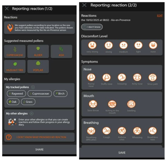 The LivePollen app is a real-time pollen measurement tool for allergic patients, also developed by Lify-Air, to distribute information on pollen exposure obtained from the processing of the Beenose sensor data. The app allows users to anonymously report their allergy symptoms, with the aim of enabling the history of allergy sufferers’ experiences (but is not a clinical report or based on a validated medical questionnaire). Each user can download the LivePollen app on their own initiative. Users are invited to report their symptoms (Figure 2), and they can select the pollen to which they think to be allergic (or to notify that they do not know what they reacted to). They have the possibility to indicate the level of their discomfort on a five-point scale, as well as the nature of their symptoms. They can also provide additional information that they consider necessary. Finally, their report is recorded in an allergy diary, which enables them to discuss with their healthcare professional. In this study, the choice was made to consider all reports without distinguishing intensities or typologies of symptoms in order to promote robust statistics. Finally, errors in the reporting, such as inconsistent symptom entries, and other possible allergen sources, moving to or from locations inside the observation area, will participate in statistical fluctuations (and thus uncertainties) of the analysis.
