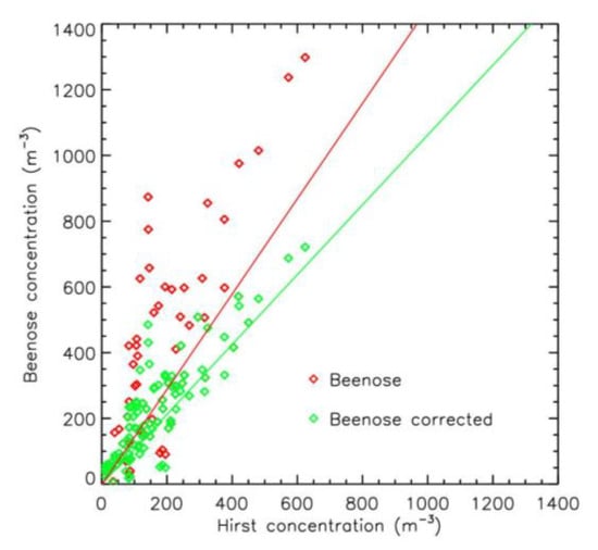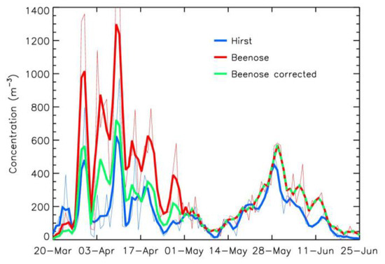 The Hirst reference sensor collects particles on a support [20]. The selection of pollen among these particles and the identification of the pollen family is performed by manual microscopic observations of the support, which is typically retrieved from the device once a week. Total concentrations are obtained by summing the concentrations determined for each type of pollen. The measurement uncertainty depends on the concentrations [39,40,41], starting at 20% for concentrations above 100 particles·m−3, reaching 150% for concentrations around 1 particle·m−3. As with Beenose measurements, a three-day sliding average is applied to the data.