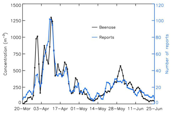 Nevertheless, the intensity values for the first concentration peak and reports peak during the first days of April are less correlated than for the rest of the season. Also, at the end of May and early June, a plateau is observed for reports while concentrations exhibit a peak; nevertheless, this difference remains close to the precision limit of the Beenose measurements and of the statistical fluctuations of the reports.