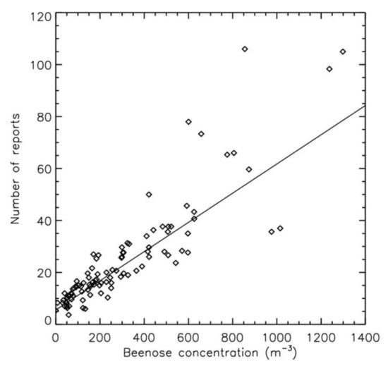 Before comparing the concentrations measured by the two devices and the reports collected on LivePollen, it was useful to present a comparison of the devices to validate their consistency. Figure 3 shows the temporal evolution of total pollen concentrations (sum of ash, Betulaceae, oak, and grass pollen concentrations) measured by the Hirst and Beenose sensors. The general trend is the same for the two sets of data, with two different pollinic periods. The scatter plot (Figure 4) shows a good correlation between the two data sets. Although the overall determination coefficient R2 remains correct at 0.64, the two different periods exhibit a different profile. The concordance between the two sensors from 1 May to the end of June during the grass pollen period is obvious, while the Beenose sensor measures much higher pollen concentrations than the Hirst sensor before 1 May during the tree pollen period. This difference is clearly shown in Figure 3 and Figure 4, which consider the tree (mainly Betulaceae) pollen concentrations measured by Beenose divided by 1.8 from 20 March to 30 April. This 1.8 value was obtained by simultaneously searching for the highest coefficient R2 (Pearson determination coefficient) and the slope for the linear fit closer to 1 in the scatter plot. In this case, the correlation significantly increases, with a determination coefficient R2 of 0.74 and a slope for the linear fit approaching 1 (1.06, compared to 1.45 before).