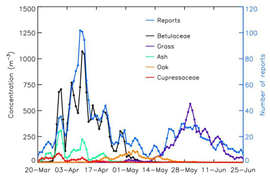 The population is generally less allergic to ash pollen than to Betulaceae pollen [5]. Thus, the population should present fewer allergic reports in the initial rising phase of concentrations ( the first peak at the end of March containing a significant part of ash pollen). Then, when reaching a sufficiently high and long exposure level to pollen, the reports achieve a better agreement with concentrations. This could also explain why reports remain high despite a slight decline in Betulaceae concentrations on 7 and 8 April.