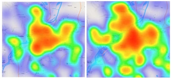 Heatmaps for the allergic symptom reports. The city of Metz is in the center of the map. Left: for the Betulaceae, on April 2023. Right: on June 2023 for grass. The coldest colours (blue) are for the areas with the fewest reports, and the warmest (red) are for the areas collecting the most reports. The maps were produced using the OpenStreetMap layer software.