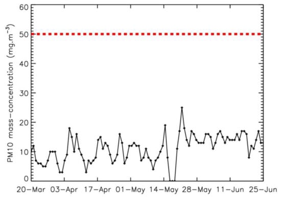 Temporal evolution of PM10 pollution; red dotted line: authorized daily limit. Reference air quality data obtained by the Atmo Grand Est network.