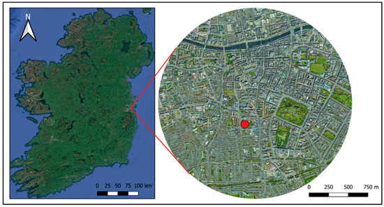 Bioaerosol monitoring and sampling was conducted at the former TU Dublin Kevin Street site (53°20′12.1″ N, 6°16′04.0″ W) (Figure 1). This site is in the centre of the capital city, a coastal metropolitan area spanning approximately 318 km2 and has a population density of 4811 people per km2 [72]. The monitored area experiences a cool temperate oceanic climate, with average annual temperatures ranging from 8.5 to 10.8 °C, nationally [73]. The region records the lowest rainfall in the country, averaging between 750 and 1000 mm per year, compared to a national average exceeding 1200 mm annually [73].