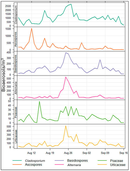 Temporal trends of the prevalent pollen taxa and their relative contributions to total bioaerosol concentrations are illustrated in Figure 2. The highest daily concentration was recorded on the 25th of August due to the presence of high ambient Urticaceae concentrations on that day. In comparison, the highest daily concentration of Poaceae was recorded on the 15th of August. Only 4 of the 41 days experienced Poaceae concentrations categorised as having a high daily ambient concentration (>30 pollen grains/m3) [97,98]. Following this, the overall trend in pollen was toward lower concentrations coinciding with the declining grass pollen season.