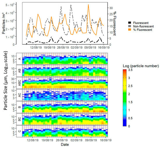 WIBS-NEO was co-located at the bioaerosol sampling site (Figure 1). It operated almost continuously (7 August 2019 12:00–16 September 2019 12:00), with only 1 brief period of inactivity registered for necessary maintenance checks. As a result, pollen/fungal spores recorded by the Hirst device during these hours were removed prior to any comparison. Additionally, daily force trigger mode ensured stable background fluorescence values so that no large variations were seen over the course of the campaign, and data could later be used to determine daily fluorescent thresholds. This threshold was determined in the same way as described in the literature previously [51,60].