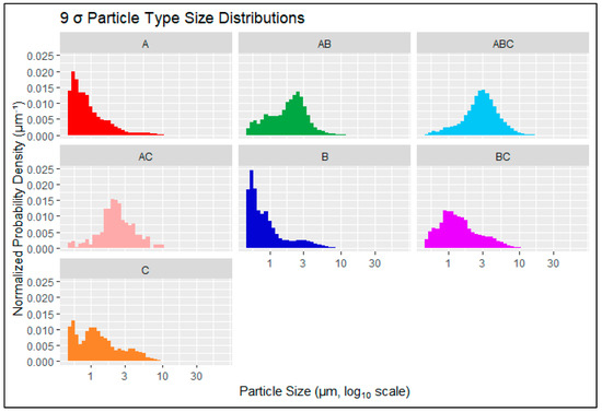 Previous studies have shown that increasing the threshold for characterisation of FAPs can greatly elucidate aerosol characterisation [60,76,108,109,110]. Thus, this same process was undertaken here, increasing the standard deviations (σ) used in the calculation from 3 to 6 to 9. The size distributions of the different WIBS channels, utilising 9 σ values (the original 3 σ are in the supplemental), are shown in Figure 4 below. Figure 4 emphasises the larger average particle sizes associated with the ABC channel, along with similar increases in the distributions in the AB, AC, and BC channels. Although it should be noted that the shapes of these distributions are quite different from each other. This indicates that after increasing the fluorescence threshold through this standard deviation approach, the particles of larger than average size that remain within these fluorescence categories could potentially be biological in nature, as their sizing of >2 µm is similar to that of the bioaerosols observed during this campaign.