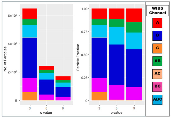 The baseline (forced trigger threshold) was set as three standard deviations (3 σ) greater than the mean background fluorescence intensity in each channel. This is determined by operating WIBS-NEO in “forced trigger mode”, whereby the xenon lamps are activated when the pump is disengaged, meaning no particles are present within the sampling chamber. This method, commonly used in WIBS field studies, ensures that the threshold accurately characterises what constitutes a fluorescent particle, or what falls below the required threshold to be considered “fluorescent” [51,77,78]. This approach helps to distinguish FAPs from other ambient particles, ensuring that only particles with fluorescence intensities that are statistically significantly higher than the background levels are classified as FAPs. Several authors, however, have varied the values of sigma greater than the mean background fluorescence intensity in each channel. This is to aid in the discrimination of particles. Similarly to those works, both 6 and 9 sigma were also utilised during this study [79]. For example, certain bioaerosols may exhibit strong fluorescence signals that allow for the utilisation of higher thresholds to differentiate them from other fluorescent interferences, while others may require lower thresholds due to their inherent fluorescence properties.