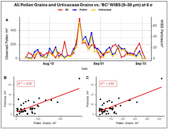 (A) Time series of Hirst total pollen counts, WIBS BC type particles, and Urticaceae pollen counts (daily). (B) Linear scatter plot of Hirst total pollen counts vs. WIBS type particles (daily). (C) Linear scatter plot of Hirst Urticaceae pollen counts vs. WIBS type particles (daily).