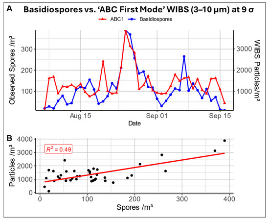 (A) Time series of Hirst basidiospore counts and ABC First Mode WIBS particles (daily); (B) linear Hirst basidiospore counts vs. ABC First Mode WIBS type particles (daily).