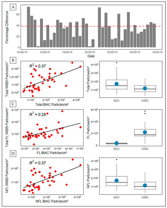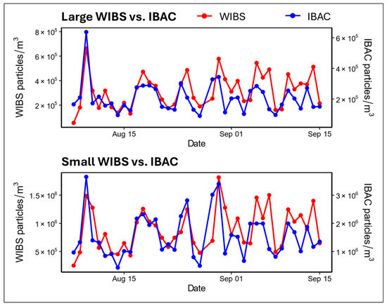 Boxplots of daily IBAC particle concentrations recorded during the monitoring campaign are shown in Supplementary Figures S1 and S2. Each boxplot represents the average hourly concentration (particles per litre) over 24 h, which minimises the number of outliers visible at the maximum temporal resolution. A notable peak in IBAC concentrations occurred on August 9th during an episode of heavy rainfall. In this case, IBAC recorded an increase in particulate numbers—likely due to sampling rain droplets—even though rainfall suppressed fungal spore release, as indicated by concurrent data from WIBS and fungal spore monitors. Conversely, during the main fungal spore peak in the last week of August, IBAC did not capture a similar increase, resulting in lower correlation values with fungal spore concentrations (see Table 3).