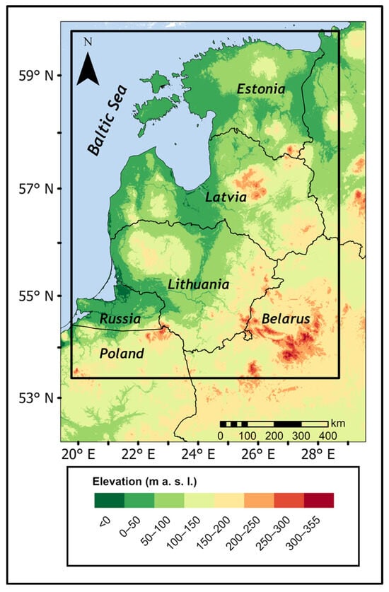 The study area is characterised by lowlands and plains, with the highest point reaching 355 m above sea level (Figure 1). According to the updated Köppen–Geiger climate classification, the eastern part of the Baltic Sea region falls under the Dfb climate type [,], where the mean temperature of the warmest month (July) does not exceed 22 °C, but at least four months per year have a daily mean temperature above 10 °C [].