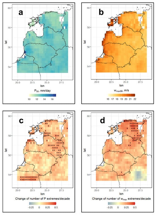 The 98th percentile values of daily precipitation (a) and maximum wind speed (b) in the study area for the entire 1950–2022 period. Decadal changes in the number of daily precipitation (c) and maximum wind speed (d) extremes in the study area. Grid cells with statistically significant changes, according to the Mann–Kendall test (p < 0.05), are marked with dots.