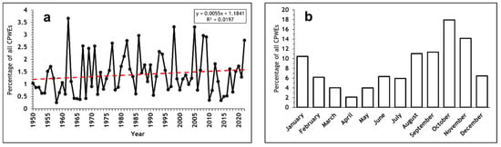 (a) The percentage of CPWEs identified annually over the 1950–2022 period, with the red dashed line indicating the trend. (b) The percentage of CPWEs identified during each month of the year.