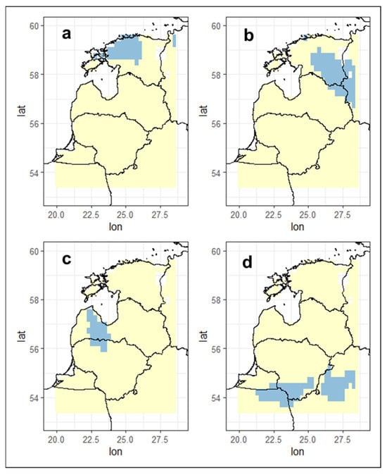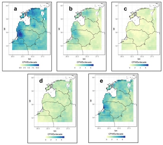 An evaluation of CPWE recurrence within each grid cell of the study area revealed that over the entire study period, the highest frequency, 10–11 occurrences per decade, was recorded in western Lithuania (Figure 4a). A similar distribution was observed in winter, with most CPWEs occurring in the western and northeastern parts of the study area during this season (Figure 4b).