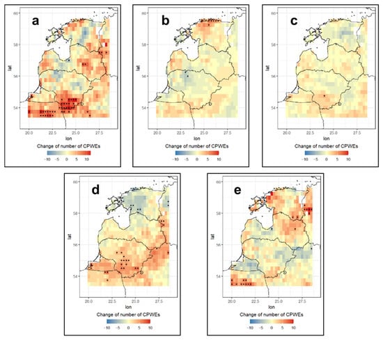 Notably, during DJF and SON, the most pronounced increases in CPWEs were concentrated in the northern part of the study area (Figure 5b,e). In contrast, during JJA, the largest growth was observed in the eastern and southern regions of the analysed territory (Figure 5c,d).