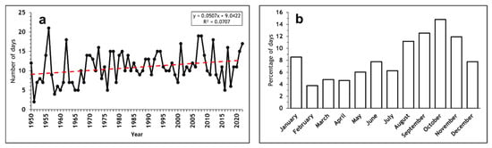 (a) Dynamics of the number of days with CPWEs from 1950 to 2022. The red dashed line represents the trend. (b) Distribution of the number of days with CPWEs throughout the year.