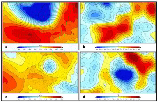 Composite analysis of the CPWEs in the cold (October–March) (a,b) and the warm (April–September) (c,d) half of the year: (a,c) sea level pressure (hPa) and (b,d) temperature anomaly (cC) at the 850 hPa level. Anomalies were calculated according to 1991–2020 daily smoothed climatology.