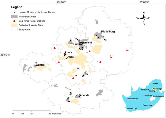 The selected areas of focus for this study were the residential areas in the vicinity of coal operations in the Mpumalanga province of South Africa (Figure 1). As far as the authors are aware, to date, only two studies have been conducted in some parts of the Mpumalanga Province to assess the influence of coal-fired power stations on indoor radon activity concentrations [15,16]. The first study was conducted in the Secunda area and recorded an average indoor radon activity concentration of 76.4 Bq/m3 [15]. The second study was performed in eMalahleni and reported an average concentration of 122.1 Bq/m3 [16], which is above the reference level of 100 Bq/m3 recommended by the World Health Organization (WHO 2009) for indoor radon exposure [14]. However, this value is well below the reference level of 300 Bq/m3 recommended by the ICRP and IAEA [17,18]. These studies were performed over a short period, for about 3 to 4 days. As such, to obtain long-term exposure levels, the current study investigated radon exposure levels over months and during various seasons to account for temporal variations. The study was also performed on a larger scale in coal industrial areas of the Mpumalanga province, which is situated in the north-eastern part of South Africa (Figure 1). The areas covered in this study included the Middleburg, eMalahleni, Phola, Kriel, Secunda, and Delmas areas (Figure 1). These areas are dominated by coal operations such as mines, coal-fired power stations, coal liquefaction plants, and coal residual products that are in the vicinity of residential areas, which include both formal and informal settlements (Figure 1).