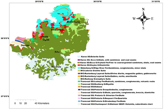 The study area is underlain by rocks of the Transvaal Supergroup, Bushveld Igneous Complex, Waterberg Group, and Karoo Supergroup (Figure 2). However, a large portion of the area is covered by the rocks of the Karoo Supergroup. These include the diamictites of the Dwyka Group appearing towards the western edges of the area and the sandstones, shales, and coal seams of the Ecca Group, which are the dominant lithologies with widespread dolerite dykes and sills. The other main lithologies found in the area are the sandstones, conglomerates, and shales of the Waterberg Group, which extend in the north-western part of the area. The rocks of the Bushveld Igneous Complex are disseminated across the study area and only cover small portions of the study extent. The rhyolites of the Rooiberg Group, which belong to the Transvaal Supergroup, also occupy a larger portion in the north-eastern part of the study area with the Chuniespoort and Pretoria Group rocks covering small portions in the south-western part around the Delmas area.