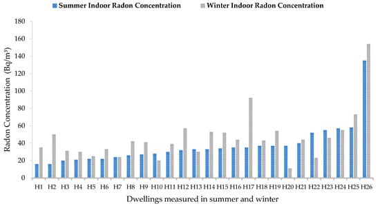 The statistical summary of indoor radon measurements performed in the Mpumalanga province during winter and summer months in areas prominent in coal industries and associated coal residual material is presented in Table 1. A total of 171 measurements were conducted in 96 dwellings during both the winter and summer seasons. The results show variabilities between the indoor radon activity concentrations recorded in the winter and summer months. In winter, the mean value of the indoor radon activity concentrations was found to be 42 Bq/m3, with a maximum value of 154 Bq/m3, whereas in summer the average and maximum values were 35 Bq/m3 and 135 Bq/m3, respectively. To further assess the variations in indoor radon activity concentrations with seasons, the activity concentrations of the 26 dwellings that were measured in both winter and summer months were compared (Figure 3). In general, it was found that the dwellings measured have higher indoor radon activity concentrations during winter months and lower levels in summer (Figure 3). The average ratio of winter to summer indoor radon levels was found to be 1.2. This shows the effect of seasonal differences on indoor radon activity concentrations.