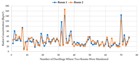 To further understand the variations in indoor radon levels, the concentrations measured in different rooms of the same dwelling for the same time frame were compared (Figure 4). Minor variations were found with an average ratio of 0.99. The slight variation in the measurements within the same dwelling are due to differences in the ingress routes of radon and ventilation rate [20]. This, therefore, indicates that radon levels vary spatially between different rooms in a house, thus, emphasizing the significance of conducting multiple radon measurements in various rooms of the house when assessing indoor radon exposures.