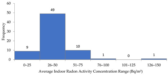 To obtain the representative indoor 222Rn concentrations for all the dwellings surveyed in the Mpumalanga Province, the measurements conducted in the same locations during both warm and cold periods were averaged. However, in households where measurements were only conducted during one season, the obtained values were then used as representative concentrations. The average radon concentrations ranged from 21 Bq/m3 to 145 Bq/m3, with a mean value of 40 Bq/m3. Most of the measured dwellings (70%) recorded concentrations that fall in a range between 26 and 50 Bq/m3 (Figure 5). In comparison with the reference level of 300 Bq/m3 recommended by the International Commission on Radiological Protection (ICRP) [17] and the International Atomic Energy Agency (IAEA) [18] for indoor radon exposure, the measured levels are well below the reference level. When the obtained concentrations are compared with the reference level of 100 Bq/m3 recommended by the World Health Organization (WHO) [14], only one dwelling was found to exceed this value. This dwelling is located in Secunda. Based on the house characteristics information acquired during the survey, it was observed that the house has sufficient ventilation openings, but it is kept closed most of the time as it is not occupied on a regular basis. As such, the extremely low ventilation rate of the house could be the cause of higher indoor radon activity concentrations due to low indoor–outdoor air exchange rate. This demonstrates the effect of ventilation rate on indoor radon activity concentrations.