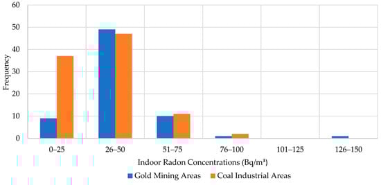 The mining and processing of economic minerals such as gold and coal combustion are typically known to contribute to radon levels in the environment [5,24]. In the coal mining areas studied in this work, it was found that the overall activity concentrations ranged from 21 Bq/m3 to 145 Bq/m3, with a mean value of 40 Bq/m3 (Table 2). In the gold mining areas, the average concentrations for all homes ranged from below detection limit to 96 Bq/m3, with a mean value of 33 Bq/m3 (Table 2). It can be observed from Figure 6 that there is no significant variation in the distribution trend of indoor radon activity concentrations in both the coal and gold mining areas. In both areas, most of the households have indoor radon activity concentrations in a range of 26 to 50 Bq/m3. However, in the gold mining areas a slight peak in the number of dwellings (38%) that falls in the lower concentration range of 0–25 Bq/m3 is observed as compared to coal industrial areas (12%). This could be because in the gold mining areas most of the measurements were taken during summer months when the ventilation rate of the dwellings is high whereas in coal mining areas most of the measurements were taken predominantly in winter months. In general, the distribution pattern follows the same trend (Figure 6), and the average concentrations recorded in both sites in almost all homes do not exceed the proposed level of 100 Bq/m3 recommended by WHO for indoor radon exposures [14] and are all well below the ICRP and IAEA reference level of 300 Bq/m3, Table 2. The average values of 40 Bq/m3 and 33 Bq/m3 obtained in the coal and gold mining sites, respectively, are comparable with the worldwide average indoor radon activity concentration of 39 Bq/m3 [14].