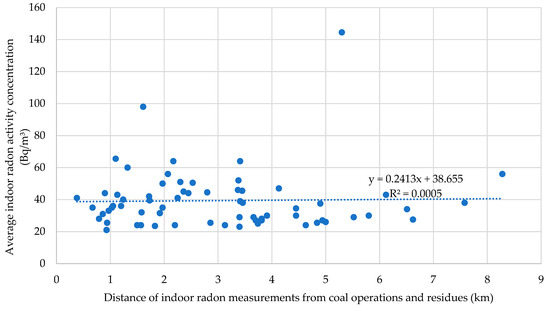 To evaluate the impact of coal industrial operations and residues on indoor radon activity concentration, the associated concentrations found in houses located at various distances from coal impacted areas were assessed. The findings show that there is no definite trend observed on indoor radon levels with increasing or decreasing distance from the coal operations with a very weak correlation of R2 = 0.0005 (Figure 7). There is no significant variance in the radon concentration range for houses that are located in the immediate vicinity of coal industries and those that are further away. Moreover, the dwelling that recorded the highest activity concentration of 145 Bq/m3 is found to be located further away from coal industrial areas and residues (>5 km). Based on the findings presented in Figure 7, it is clear that the numerous coal mines, coal-fired power stations and residual material found in the Mpumalanga province do not contribute significantly to the indoor radon activity concentrations in the six main residential areas located in the vicinity of these operations. The findings of the long-term measurements presented in this paper corroborate with earlier studies performed using short-term measurement techniques in eMalahleni and Secunda, which found that the fallout from the coal industrial operations surrounding these towns does not enhance the activity concentration of radon [15,16].