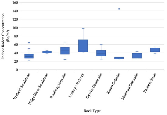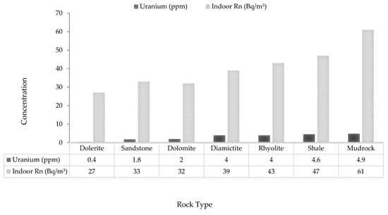 To assess the influence of geology on indoor radon levels, the concentrations associated with various geological formations were analyzed. The analysis was performed using Geographic Information Systems (GIS) by overlaying the measured indoor radon data with the geological map presented in Figure 2 to identify the geological units found beneath the dwellings that were monitored. Thereafter, dwellings that fall within the same geological formations were grouped, and statistical analysis was performed to observe trends in activity concentrations associated with various rock types. Overall, the higher radon average values are associated with areas underlain by mudrocks, shale, rhyolite, and diamictites. These are rock types commonly known to contain higher levels of uranium [25]. The higher indoor radon levels associated with the Dwyka diamictite may be due to the rich phyllosilicate minerals found in its matrix [26], which have a high affinity to absorb uranium isotopes [27]. On the other hand, the rock types with radon concentrations in the lower range are sandstones, dolomite, and dolerite (Figure 8). It can be observed in Figure 9 that the rock types associated with lower indoor radon activity concentrations contain low levels of uranium and those with higher radon activity concentrations contain higher uranium levels. There is a general increasing trend in indoor radon activity concentrations with increasing uranium concentrations in rocks (Figure 9). This is expected as the higher the uranium concentration in an area, the greater the probability of high radon accumulation in indoor air [25]. These findings reveal that the uranium content found in rocks has a major impact on radon levels found in dwellings across various areas.