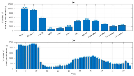 Upon inspecting the data, it was observed that the recorded taxi times for certain movements were either unusually short (for 212 movements, the taxi time was 0 s) or long (as much as 13 h in one case). Such values were assumed to be erroneous and caused by technical limitations of the A-SMGCS; therefore, the corresponding records were removed from the data. In the case of arrivals, this concerned 298 values shorter than 40 s or longer than 1620 s (27 min); in the case of departures, 147 values shorter than 60 s or longer than 2040 s (34 min) were removed. The boundaries were set heuristically based on inspection of the data, with the aim of minimizing the number of false positives (i.e., correct values wrongly removed). Finally, 6 records corresponding to the aircraft type designator “ULAC” (ultralight aircraft) were removed as further specification of aircraft type necessary for the emissions calculations was missing here. The data remaining after the filtration described above were used in all further analysis; the monthly and weekly variations in movement numbers are shown in Figure 1.