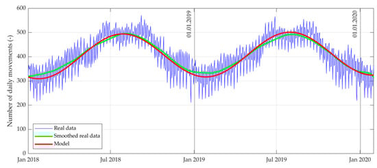 The model coefficients were estimated in MATLAB R2024a using the Curve Fitting Toolbox 24.1. First, the coefficient c5 was estimated using the poly1 fit type. Then, the last term of Equation (2) was subtracted from y. The mean of the remainder was then evaluated, which gave the coefficient c4. This, too, was then subtracted from the remaining y, which allowed the remaining coefficients c1–c3 to be evaluated using the sin1 fit type. Table 2 lists the resulting values of the model coefficients that were used for the subsequent estimation, while Figure 2 shows the time series model defined by Equation (2) plotted against the real data (daily numbers of IFR movements as per EUROCONTROL [43]). The R squared of the model was 0.695 (0.971 when using daily traffic data smoothed using the moving mean with window size 100).