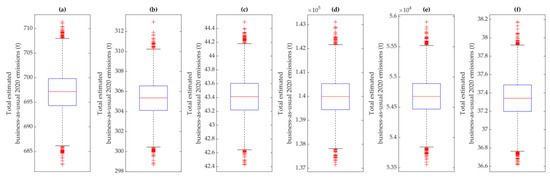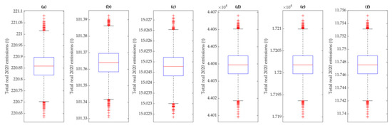 Figure 8 shows the total estimated business-as-usual LTO aircraft emissions at LKPR in tons during 2020 for each emission species. Once again, the results are presented in the form of boxplots. Similarly to the real emissions, CO2 emissions were dominant, with a median value of around 140,000 tons, representing a 317.9% increase compared to the real emissions. Similar percentage increases were observed for other species, such as 315.7% for NOX or 301.3% for CO. In other words, according to the results, the total real LTO emissions for 2020 were, in general, at around a third of what could have been expected under normal circumstances.