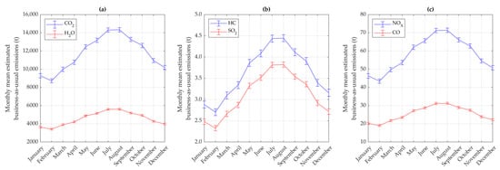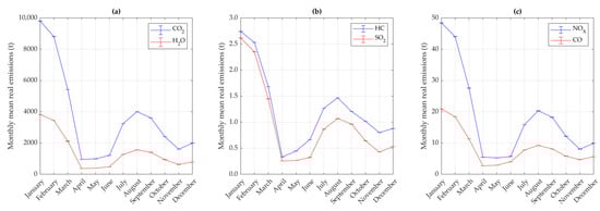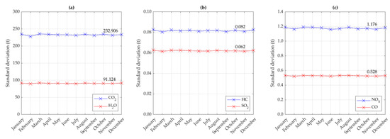 Monthly standard deviations including mean values per emission species: (a) CO2 and H2O; (b) HC and SO2; (c) NOX and CO.