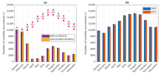 (a) Estimated monthly business-as-usual numbers of aircraft movements and real monthly numbers of aircraft movements according to A-SMGCS and EUROCONTROL [43] at LKPR in 2020. (b) Real monthly numbers of aircraft movements according to EUROCONTROL [43] at LKPR in 2018 and 2019.